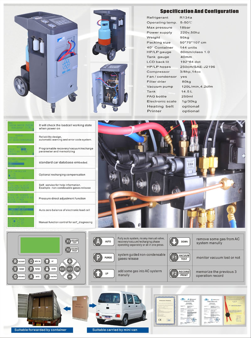 | 1.全电磁阀系统,无手动阀操作2.内置全系车型数据库3.自助电子称校准功能4.自助混杂气体排放5.自助帮助信息提示功能6.流程全自动7.系统压力直接增减 |